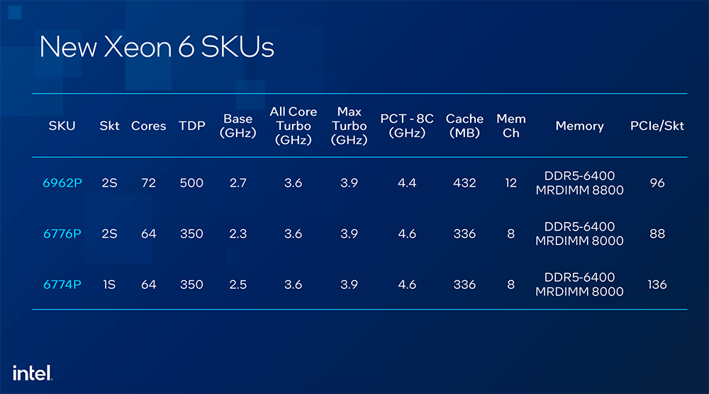 而三款全新至强6 SKU最多支持8个PCT核心,也就是说,8个PCT核心可以运行到更高频率上,64核最高可以跑到4.6GHz,72核可以跑到4.4GHz,剩下的核心运行在基频上。