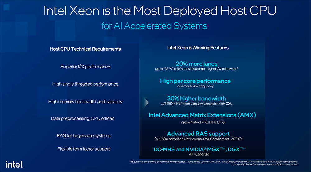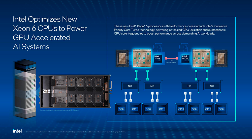 英特尔技术专家谈道,作为主控CPU,至强6与GPU协同工作,其系统性能受到多种因素的影响,包括I/O、核心性能、内存带宽和容量、CPU上的预处理或卸载能力、整体CPU系统的RAS,以及各种硬件的外形设计等。